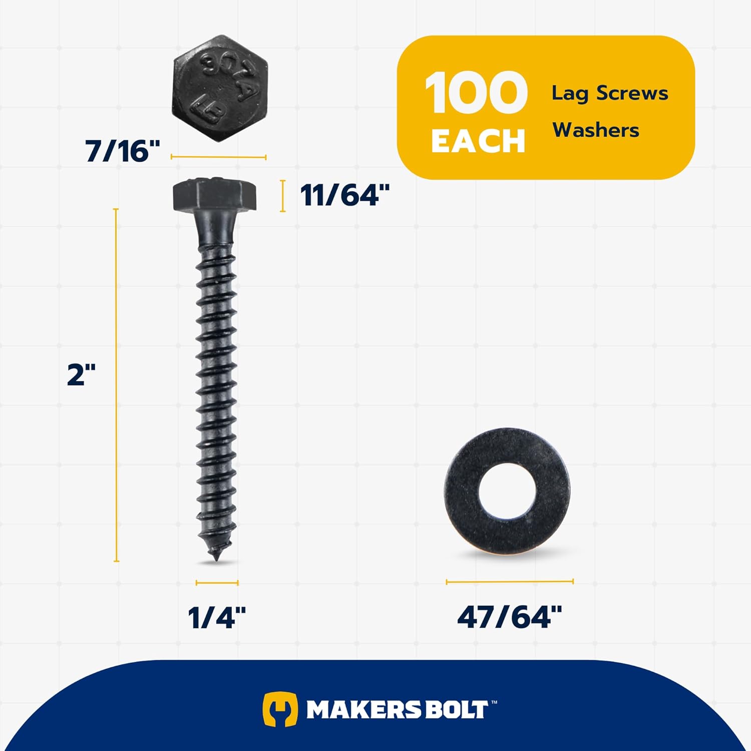 | Set Name | Makers Bolt 1/4 x 2 Black Ruspert Coated Lag Screw Kit (100 Screws + 100 Washers) |