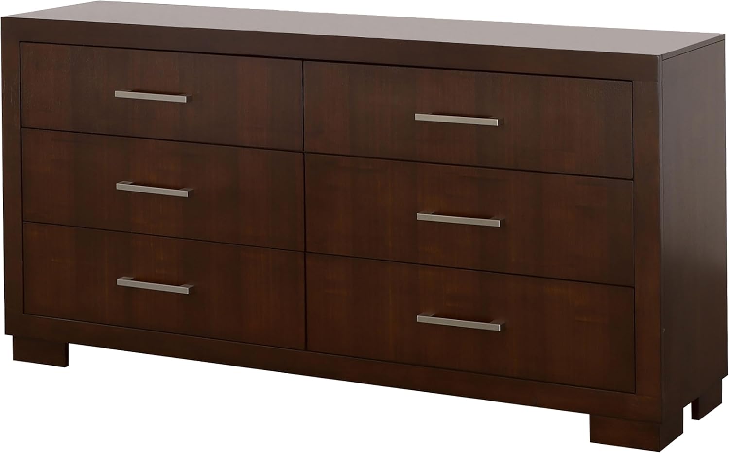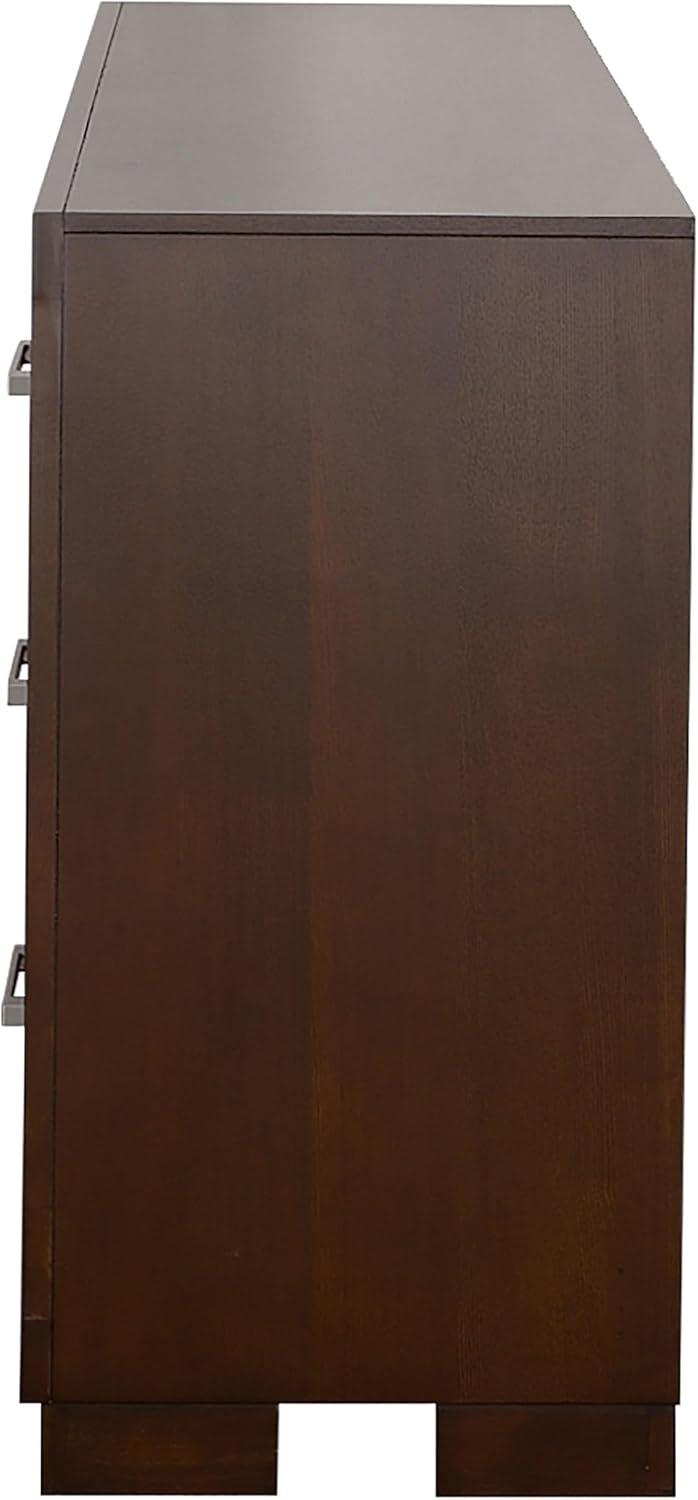 Fashionable and functional, this dresser is a fabulous addition to any bedroom. It features six spacious drawers, offering a vast array of storage options. The drawers are lined with felt, adding softness and extra protection for your most delicate items. A smooth finish of rich cappuccino and silver bar handles complete its sophisticated look. Whether placed in a guest room or master en suite, this dresser adds functionality and stylish appeal.