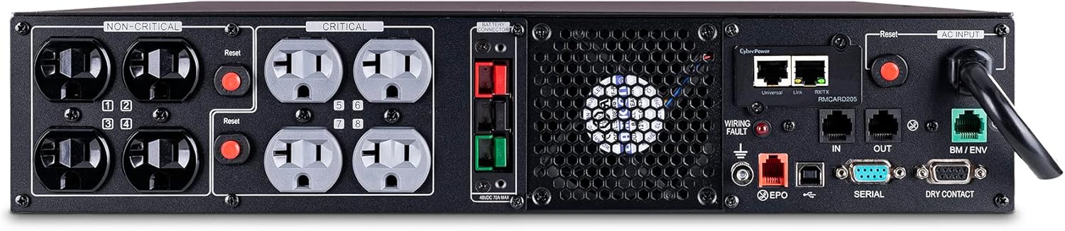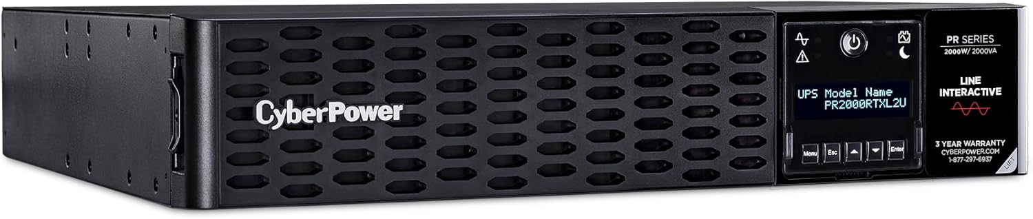 The PR2000RTXL2U is a Smart App Sinewave rack/tower convertible UPS with line-interactive topology surge protection and battery backup Cyber Power's Smart App Sinewave series has sine wave output to eliminate power gaps that can be detected by sensitive equipment and cause unexpected shutdowns The Smart App Sinewave PR2000RTXL2U improves battery life through battery equalization technology and Automatic Voltage Regulation (AVR) which corrects minor power fluctuations without switching to battery power The enhanced chassis design with an easy-to-access tool less front panel captive screws for battery panel access and color-coded rear panel make battery changes and installations simple and fast The PR2000RTXL2U also has an innovative LCD panel that rotates 90 Degree tilts for a better viewing angle and provides information on 47 different settings including UPS stats UPS setup and control management and testing options This model accepts the BP48VP2U02 Extended Battery Module (EBM) for expanded runtime during power outages and the RMCARD205 network management card for remote management and control via a standard web browser or network management system With a 400 000 connected equipment and a three-year manufacturer warranty you can trust Cyber Power's commitment to the quality of the PR2000RTXL2U