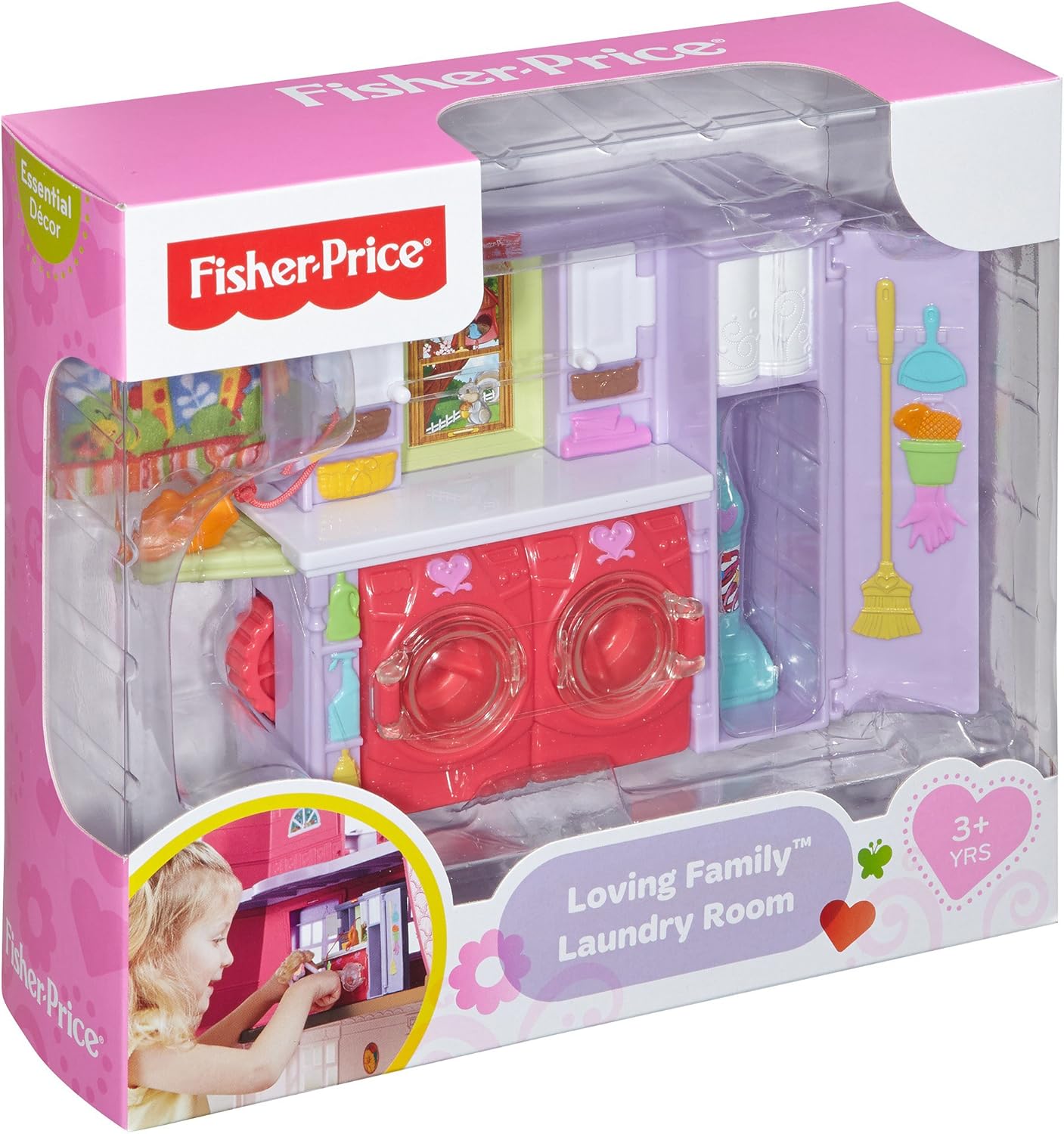 Product Description Doing laundry won't be a chore at all when it's this fun and interactive! Your little housekeeper can open and close the doors on the front-load washer and dryer, add the laundry soap, spin the dial to rotate the clothes, pull out the ironing board and press the clothes with the tethered iron. When the laundry's done, it's on to vacuuming and cleaning! There's a storage closet to hold the free-standing vacuum and molded-in cleaning supplies. Add this set to the Loving Family Dollhouse to keep it spic and span! (Sold separately and subject to availability.) Brand Story By Fisher Price