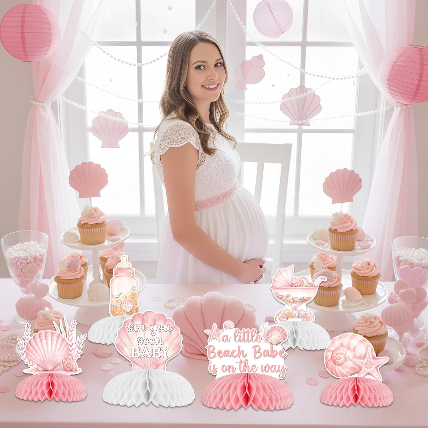 Create a warm coastal atmosphere for your baby shower with this beach themed honeycomb centerpiece set. Featuring watercolor seashells, a pink stroller, a baby bottle, sea stars, and soft pastel designs, these decorations bring a gentle ocean glow to your celebration and perfectly match a beach baby shower for a girlPackage include 8*honeycomb centerpieces