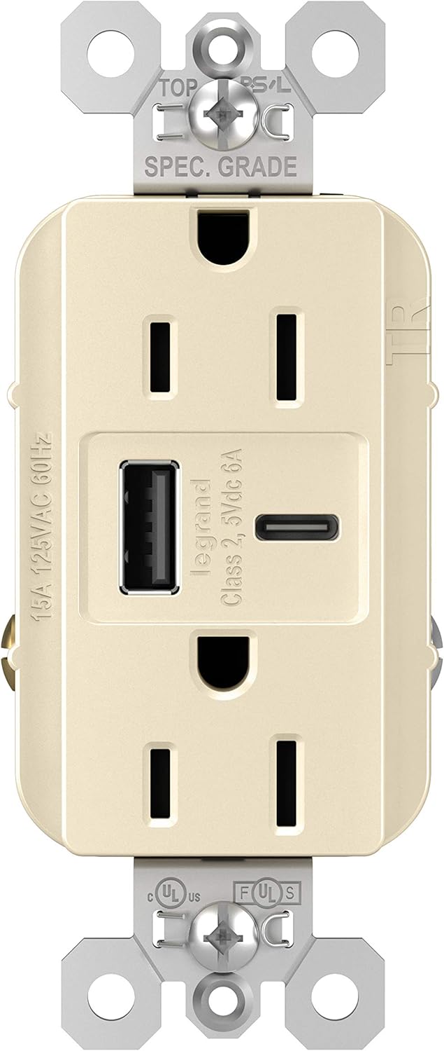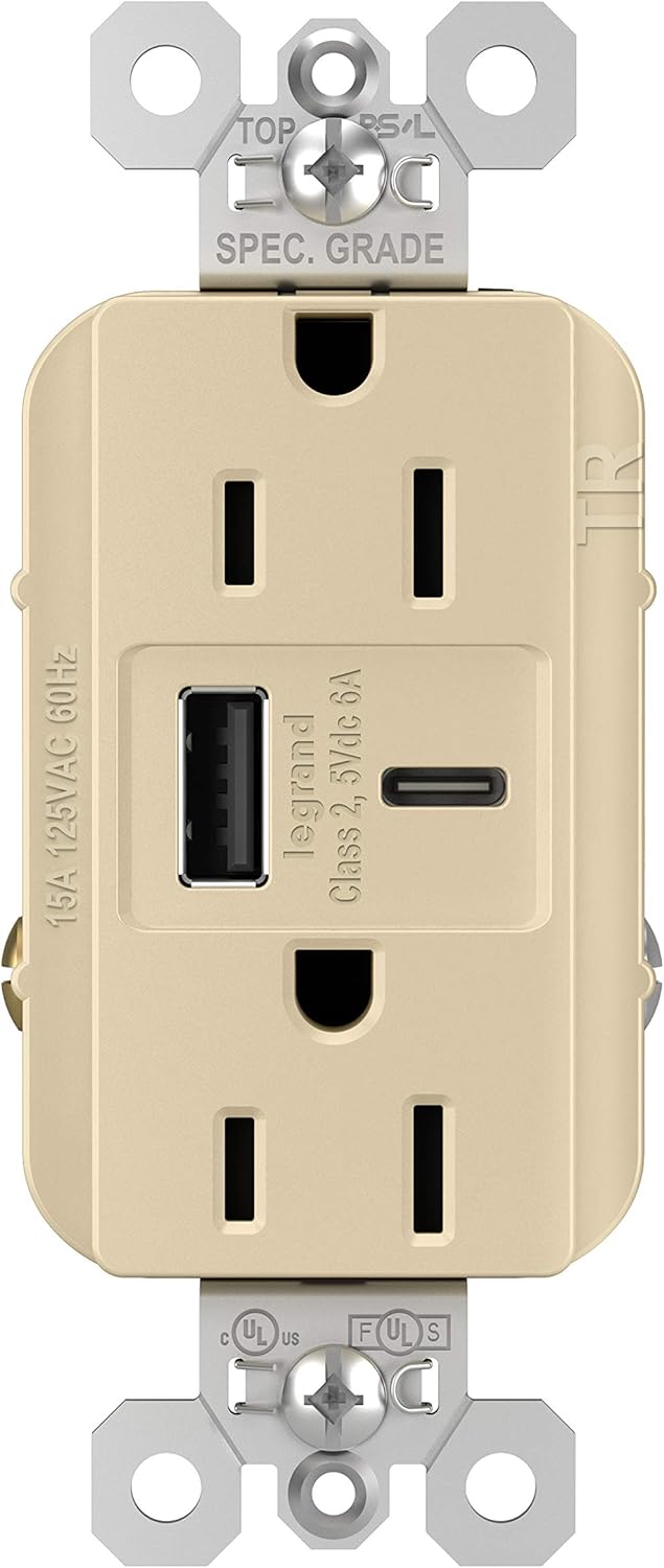 Pass & Seymour Hybrid A/C 6. 0A Ultra-Fast USB Chargers power up mobile devices quickly, reliably and without the need for bulky AC adapters in busy commercial environments where charging is a necessity. Standard power meets modern convenience with this clever integration of two USB charging ports (one Type-A, one Type-C) that provide 6. 0 amps of combined ultra-fast charging power right along side standard power outlets. Pass & Seymour hybrid USB / power outlets charge just about any mobile device, regardless of the type of charging port. Ideal for commercial environments. This device features an overall 6. 0A ultra-fast USB charging capability in two USB charging ports coupled with two AC tamper-resistant receptacles.