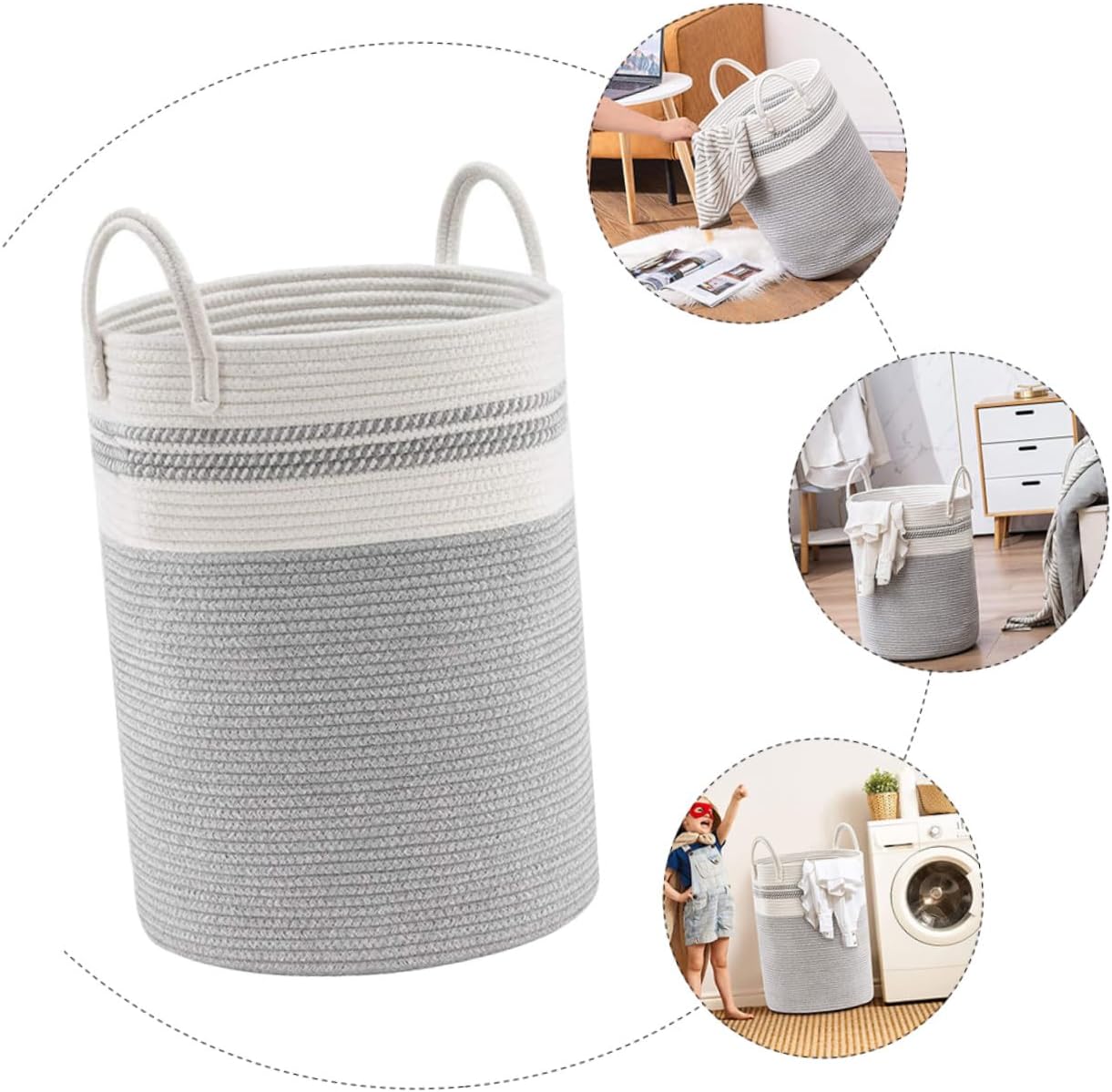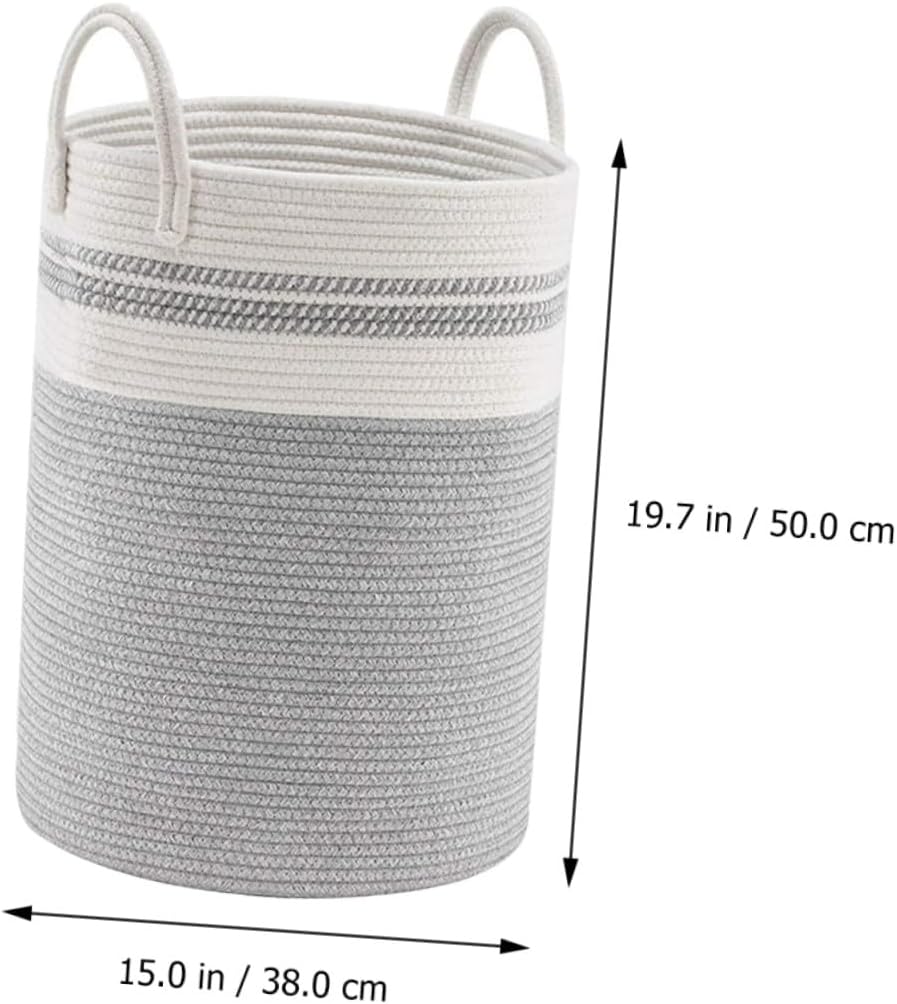 Package Include 1 x woven basket Features - Color: White and gray. -Product Info:Storage basket - Material: Cotton rope. - Size: 50.00X38.00X38.00cm/19.65X14.93X14.93in. - The lightweight design with hollow handles makes these baskets easier to move and place them in a reasonable place laundry room weave basket. - Hand-woven with wood chips, the surface is textured, which can add realism to any room multipurpose basket. - These baskets can add practical and charming decoration to any room, and can be well placed for laundry supplies and sundries storage container. - This storage basket is the perfect combination of fashion and convenience. It has a large capacity and is convenient for placing more clothes for changing clothes home decorative basket. - Very suitable for space optimization, the baskets can be stacked to save space woven storage basket.Goods Informationgarden weave basket It can be placed next to the washing machine in the bathroom to temporarily store the laundry.gray weave basket The product is a straw storage basket with a large circular opening design, which can accommodate small items and is convenient to place.office storage basket The storage basket is suitable for most occasions, such as bedrooms, bathrooms, offices and rooms